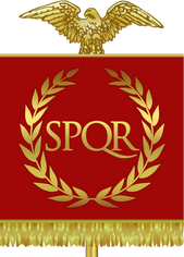 The vexillum, or legionary standard, was carried at the forefront of the Roman battalions alongside the eagle and the SPQR letters of Rome. Following this is a construction signature of the Sixth Legion Ferrata from the aqueduct in Caesarea. The inscription, discovered near the ancient city, dates back to the reign of Emperor Hadrian (130 AD) and is currently housed in the Rockefeller Museum in Jerusalem. This inscription, along with the next three, is on stone markers known as "tabula ansata." A tabula ansata features a surface with two "ears" extending from it, and these were also used as banners.