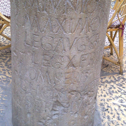 A milestone with the dedication of a soldier to the Tenth Legion Fretensis (can be seen in the fourth line of the text: the name of the Tenth Legion in initials: LEG X FRE.) The pillar is at the entrance to the Imperial Hotel, near the Jaffa Gate. The same signature appears in the tabula ansata at the Abu Ghosh Monastery, near Jerusalem.
